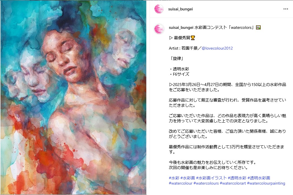 当教室の主宰 若園千景が日本文藝様主催水彩画コンテスト「watercolors」で最優秀賞に選ばれました!