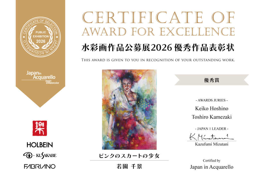 当教室の主宰 若園千景がJapan in Acquarello2026で優秀賞を受賞しました!